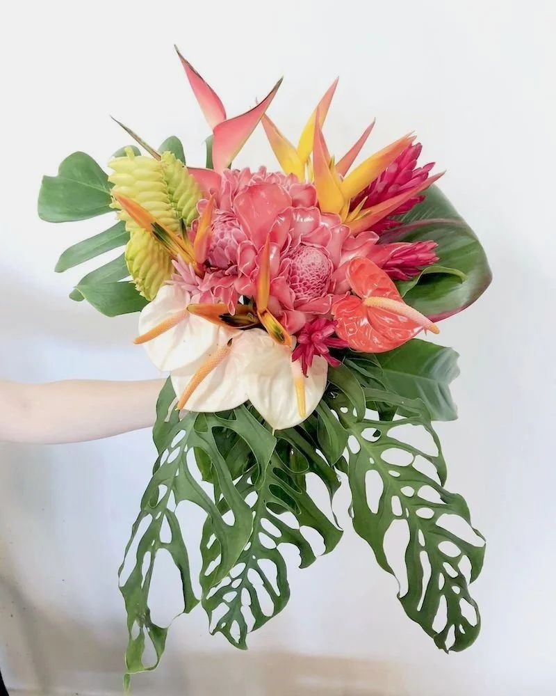 Bright flowers complement draping greens to capture to jungle in your hands.
