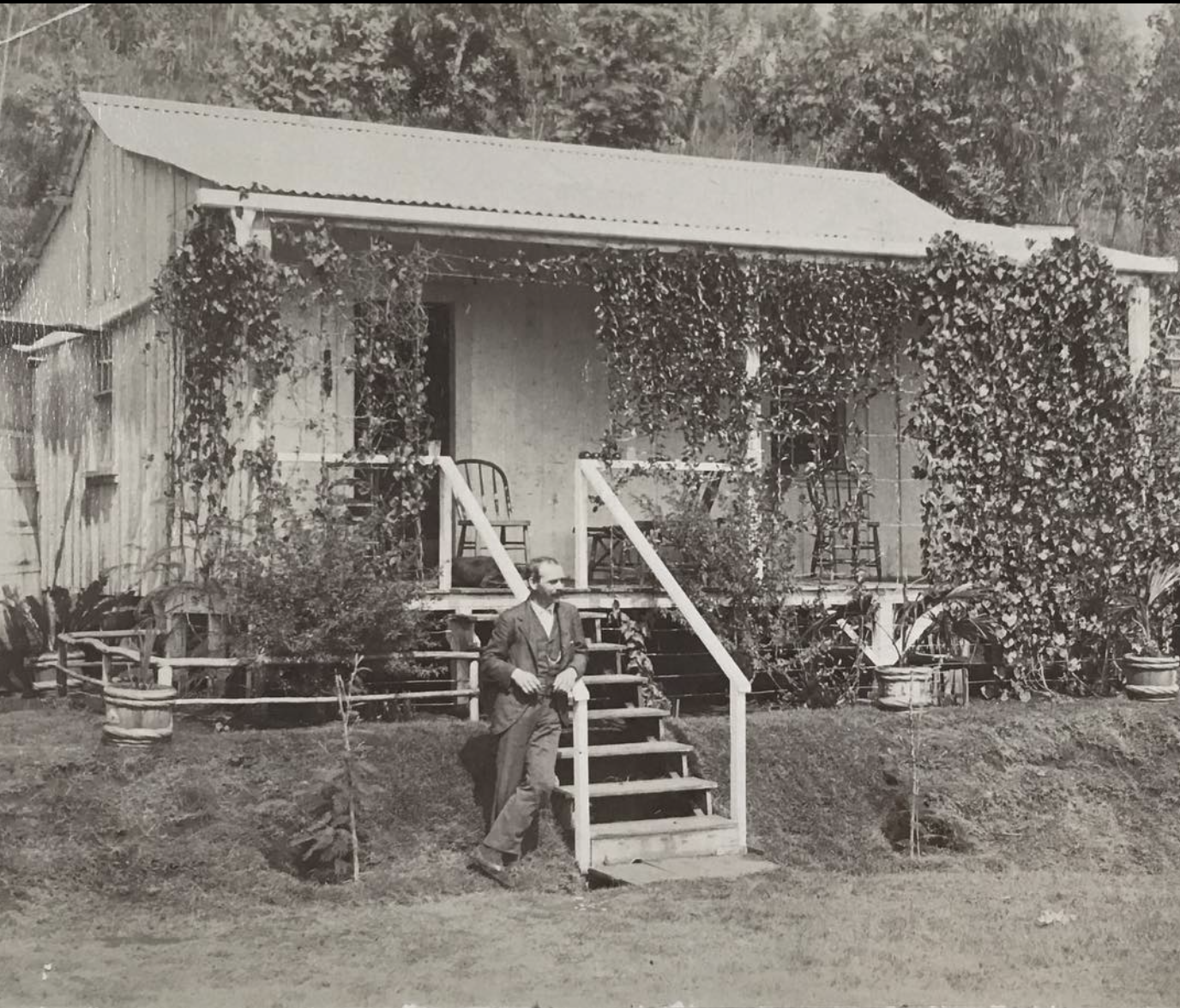 Pictured in the foreground is David Haughs, the manager of the Half-way House and an influential nurseryman in charge of the selection, distribution and growing of new tree species for the Division of Forestry in the Territory of Hawaii. He is credited with the reforestation of Tantalus, although he inadvertently introduced some of the most invasive trees in Hawaii.